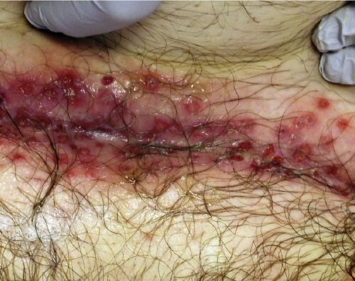 病歴/身体所見 ・78歳男性 ・糖尿病と慢性腎臓病のため通院している ・下腹部と左鼠径部の皮疹の増悪のためER受診 ・当初外来では、corticosteroids+clotrimazole軟膏とcephalexin+sulfamethoxazole/trimethoprim内服10日間で治療された ・全身状態は良好で…