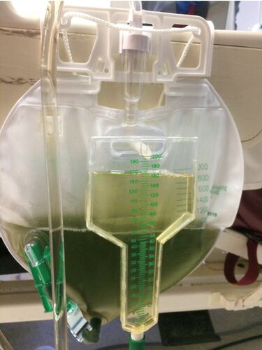 病歴/身体所見 ・62歳男性 ・COPD既往あり ・2日前から持続する呼吸困難のためER受診 ◦2型呼吸不全を呈していた ・気管挿管され人工呼吸器が装着された ・鎮静薬としてpropofol持続静注が開始され、ICU入室となった ・入院第5病日、尿が緑色に変色していた …