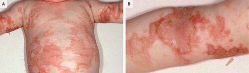 病歴/身体所見 ・4か月男児 ・6週間にわたり増悪する皮疹のためクリニックを受診 ・患児は完全母乳栄養 ・腹部/四肢/会陰部/顔面に境界明瞭でわずかに盛り上がった紅色局面を広範囲に認めた 検査 ・血液検査…亜鉛226μg/L(3.5μmol/L)(基準値:600-1200μg/L [9…