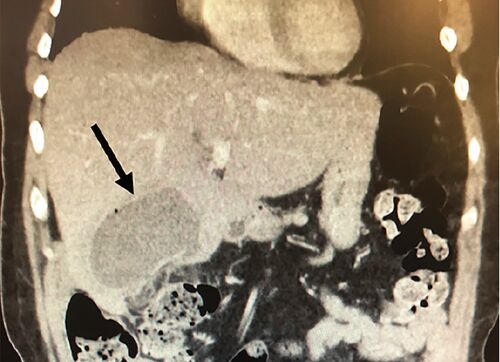 病歴/身体所見 ・61歳女性 ・数日間持続する右季肋部痛のためER受診 ・受診18日前に急性胆嚢炎に対して腹腔鏡下胆嚢摘出術が実施されている ・バイタルサイン:HR110bpm ・腹部触診で、右季肋部に中等度の圧痛を認める 検査 ・造影CT:辺縁造影効果を伴う7.3…